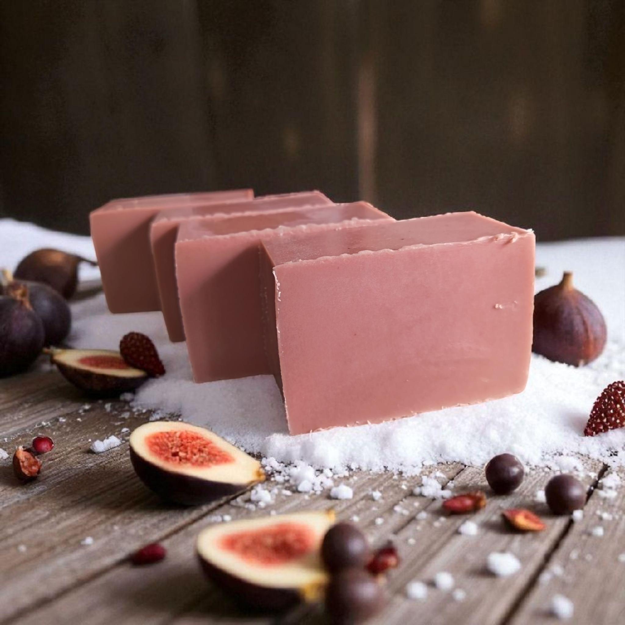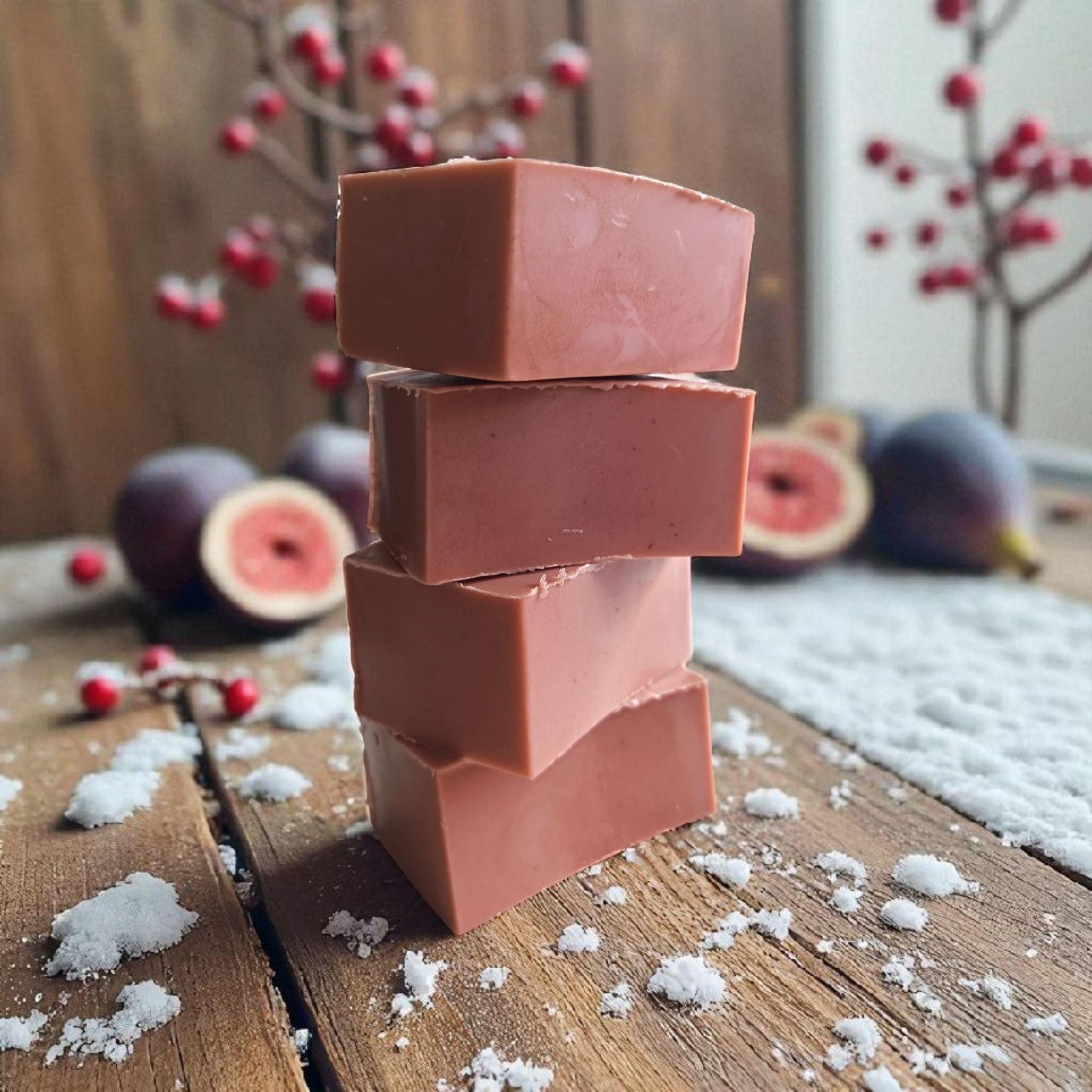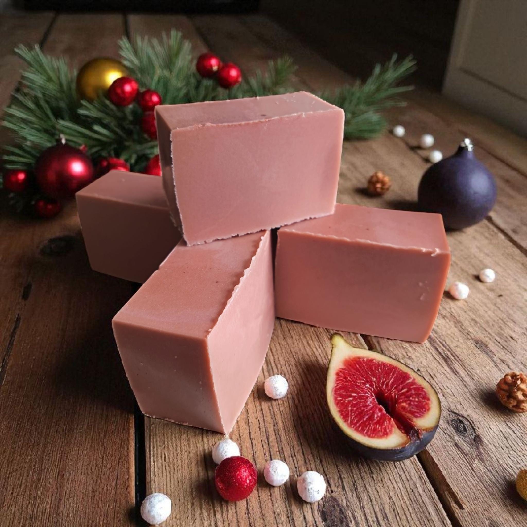 Indulge in the luxurious scent of festive fig and snowberry with our handmade goats milk soap. Crafted with nourishing ingredients, this soap will leave your skin feeling soft and moisturised all winter long. Treat yourself or gift it to a loved one for a truly pampering experience this holiday season. This fragrance has been created using a wintery blend of succulent fig notes, captivating bayberry and snowberry fusion, peppery hints and cedar wood. Delightful nuances are offered by raspberry, sultana and cocoa bean to transport you right into a winter wonderland!